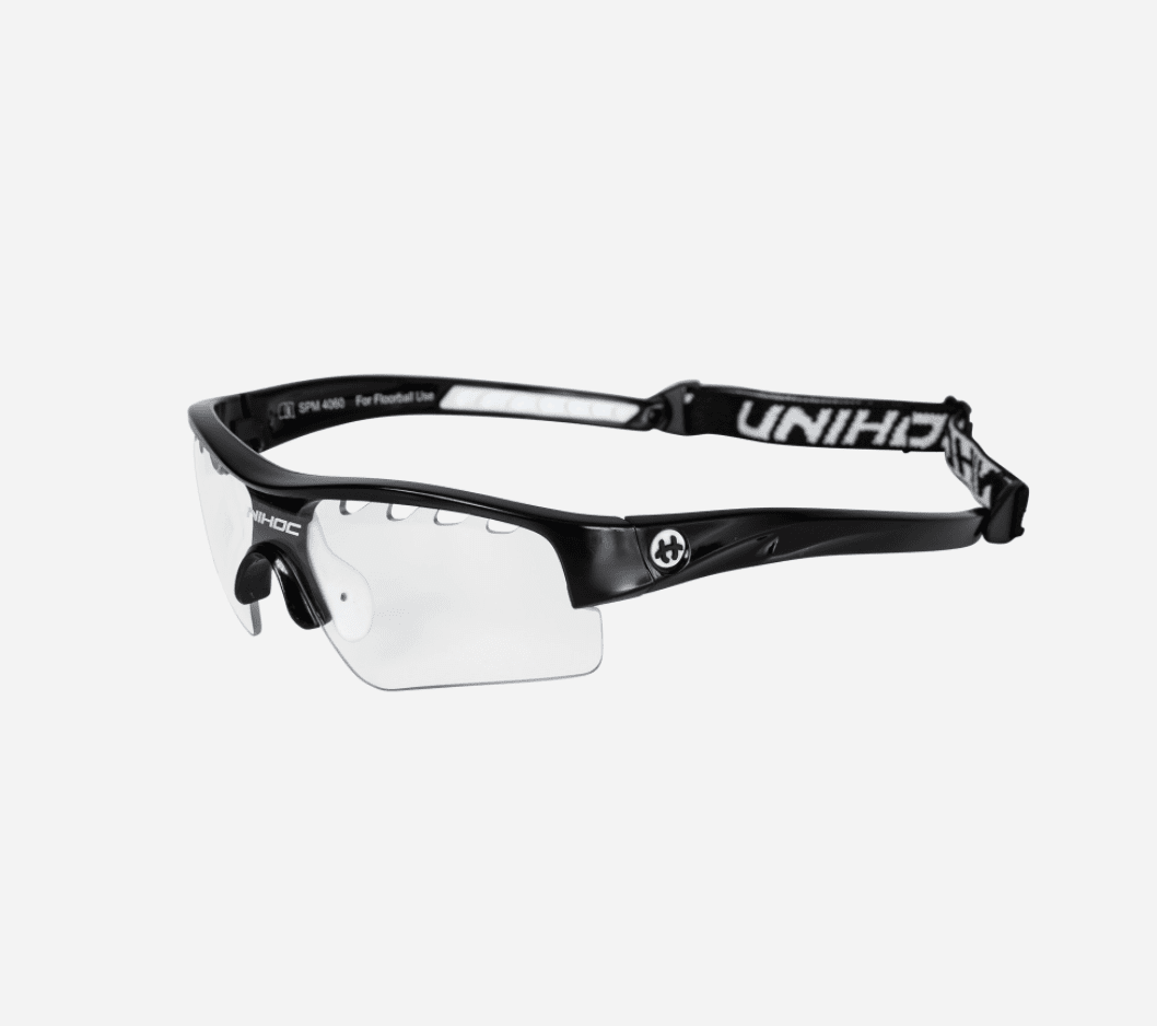 Moderna skyddsglasögon i junior-storlek, speciellt framtagna för innebandy. Justerbart huvudband. Okrossbara, imfria glas. Rekommenderas av IFF. Levereras med praktiskt skyddsfodral i tyg.