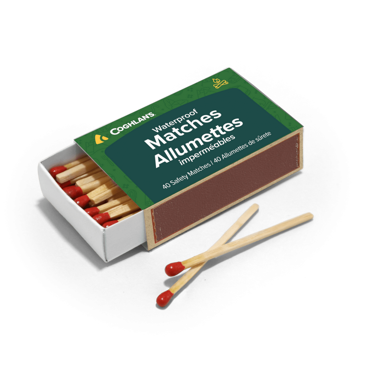 Coghlans vattentäta tändstickor är ett pålitligt sätt att tända eldar, spisar, ljus, myggspiraler och mer även efter att de blivit blöta. Perfekta för campingturer, på båten, i stugan eller på bakgården. Varje ask levereras med en tändyta som kan användas efter att de blivit blöta. Dessa tändstickor kan inte tändas av misstag, vilket gör dem säkra att bära och förvara tillsammans med annan campingutrustning.